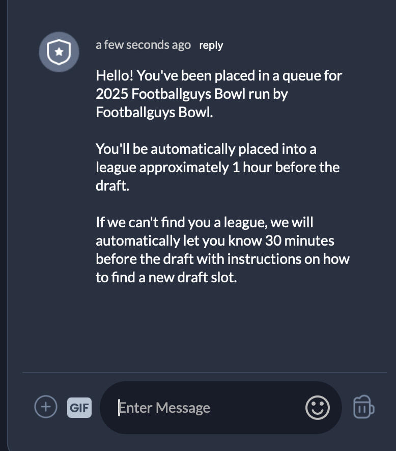 All Online Drafts have concluded for the 2025 Footballguys Bowl, Good Luck this season!